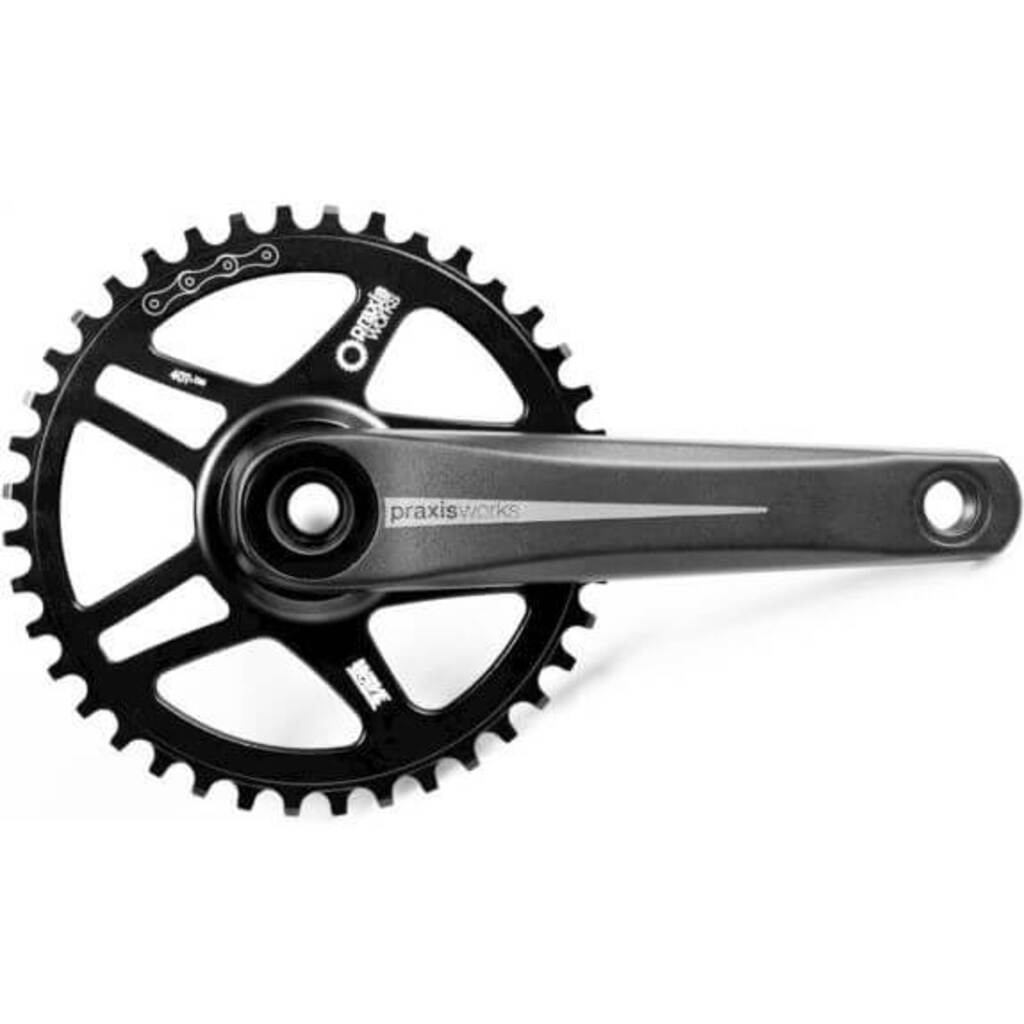 Praxis crankstel Zayante M30. De Zayante zorgt, met een 30mm as en hollow-forged aluminium crank armen, voor veel stijfheid en optimale overdracht van kracht. De 2x kettingbladen hebben koud gesmede tandbladen die zorgen voor een hardere en betere bestendigheid tegen slijtage dan CNC gefreesde tandbladen. Daarnaast biedt dit proces het voordeel dat de Levatime eenvoudig toegepast kan worden. LevaTime is een unieke techniek waarbij alle tanden een eigen vormgeving hebben, dit zorgt er voor dat een ketting perfect van het binnen- naar het buitenblad kan schakelen. Het single kettingblad beschikt over de WAVE technologie, doordat de tanden om-en-om links en rechts uitgelijnd zijn zorgt dit voor een zijdelingse spanning op de ketting wat er voor zorgt dat de ketting op het voorblad blijft liggen De armen van de cranks zijn verkrijgbaar in de lengtes 165, 170, 172.5 en 175mm.Voor dubbel: 2x-rings met aluminium CR bolts, verkrijgbaar in 46/36, 48/32, 50/34, 52/36, 53/39 tands. Geschikt voor